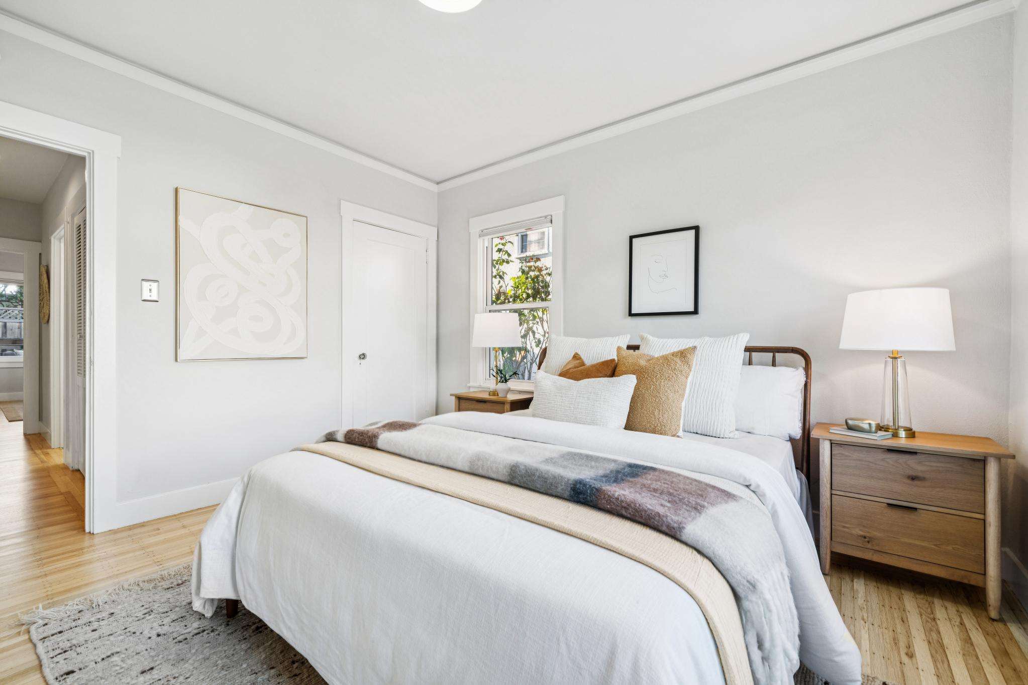 Stroll into the spacious living room, where oversized windows, hardwood floors, and modern light fixtures create an airy, light-filled retreat. It’s the perfect space for relaxing or entertaining, full of warmth and style. Both sizable bedrooms feature refinished hardwood floors, deep closets, and an abundance of natural light; offering cozy and comfortable spaces to unwind at the end of a long day.